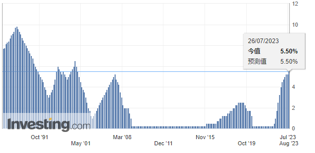自去年3月以来,为了冷却需求和抑制通胀,美联储已经执行了11次加息,累计幅度达到了525个基点。目前,联邦基金利率目标区间已升至5.25%-5.5%之间,为2001年以来的最高水平。
