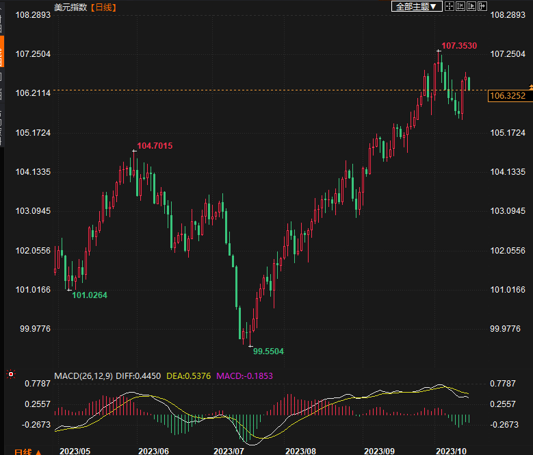 汇通财经APP讯——周一(10月16日),美元维持在一周高点附近,中东冲突背景下市场情绪脆弱,支撑了对避险货币的需求。美元指数下跌0.26%至106.38,但仍接近上周五触及的高位,投资者也在等待本周晚些时候美联储主席鲍威尔的讲话,以获取有关美国利率前景的线索。
