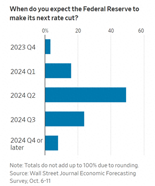 大约一半的经济学家预计,随着经济增长放缓,美联储将在明年第二季度开始降息,而失业率将从9月份的3.8%升至明年6月份的4.3%。