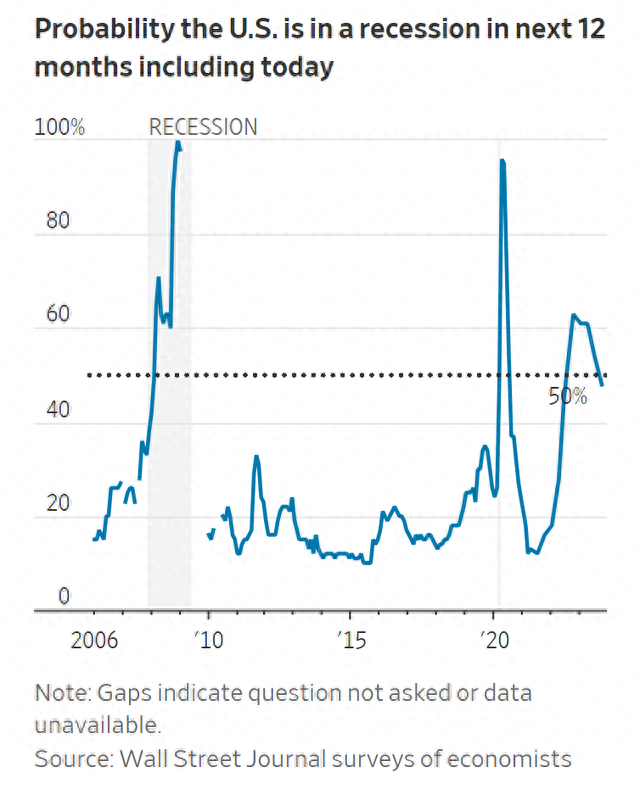 最新的季度调查中,经济学家降低了对明年经济衰退的预期,从7月份的平均54%降至更为乐观的48%。这是他们自去年年中以来对经济衰退的预期首次降至50%以下。