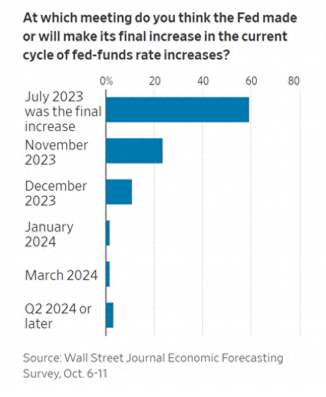 近60%的经济学家说,美联储在7月份将基准利率上调至5.25%-5.5%的22年高点后,当前的加息周期已经结束了。另外,大约有23%的人预计11月还将有最后一次加息,11%的人预计将在12月。