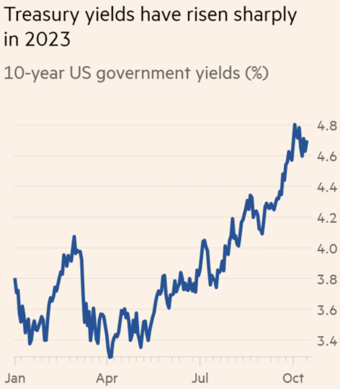 对于收益率过山车式的波动,有现成的短期解释,这种波动在美国及其他地区引起了极大关注。上周早些时候,几位美联储官员发表的鸽派言论影响了市场情绪,暗示可能不会进一步加息,因为市场一直在为他们做繁重的工作(美债收益率的飙升相当于加息的效果),以及地缘政治担忧引起的避险需求加剧了收益率走势。债券大幅上涨,收益率下降。