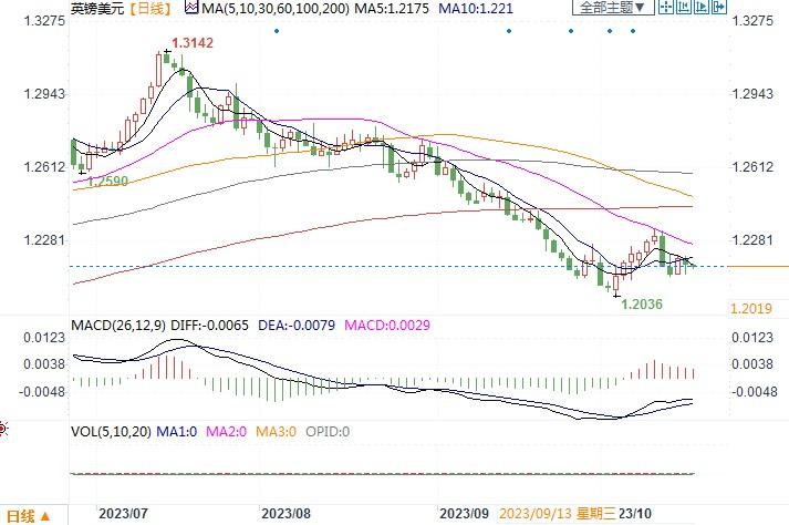 周二(10月17日),英镑/美元尾盘报1.2174美元,日内下跌0.34%。尽管包括失业率在内的一些劳动力市场数据推迟到下周公布,但英国工人的固定工资增长速度从之前的历史高点放缓,职位空缺也有所下降,截至8月底的三个月里,英国不包括奖金在内的平均收入较上年同期增长7.8%,低于截至7月的三个月同比增长7.9%,是自1月以来的首次增幅放缓。工资增幅下滑缓解了对近期可能再次加息的担忧。野村证券的分析师甚至表示,根据最新数据,他们认为英国加息周期已经结束。本周三还将有英国消费者物价指数(CPI)公布,若也呈现回落之象,将进一步提高英央行将会结束加息周期的预期概率。如此,短期内英镑恐仍要受压下行。日线图上,镑美紧贴在布林带通道中轨线附近,走势偏于窄幅,虽偏于弱势,但下行动能似乎也开始渐渐减弱。预料短期内波幅将主要陷于1.2100-1.2300之间。