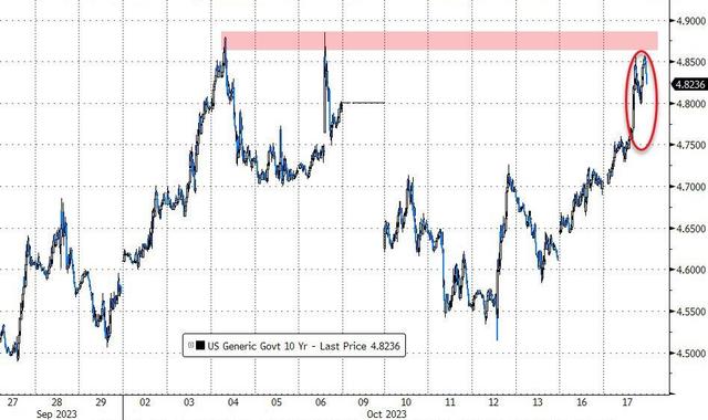 基准十年期美债收益率迅速冲上4.80%,美股午盘曾接近4.86%,刷新10月6日以来高位,逼近10月6日刷新的2007年7月以来高位。