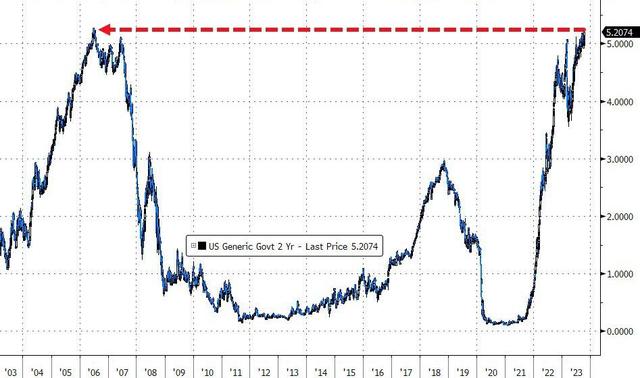 对利率前景更敏感的两年期美债收益率在美股午盘曾接近5.24%,刷新2006年7月以来高位。