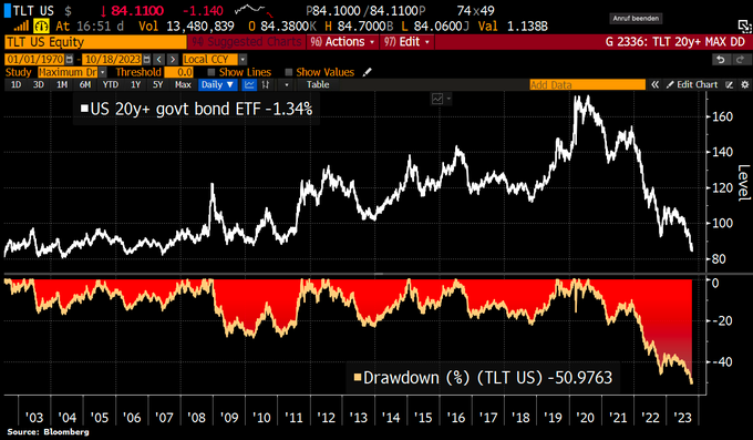 在本周,最大的美国长期国债交易所交易基金(ETF)——Shares安硕20年期以上美国国债ETF(代码TLT),已正式宣告从历史高位“腰斩”。该ETF目前较2020年创造的的历史高点下跌了51%,最新交易价格已来到了2011年以来的最低。
