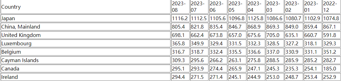 在其他美国主要海外“债主”方面,日本在8月仍是最大的美国国债海外持有国。当月日本持有的美国国债规模为11162亿美元,较7月持仓环比增加了37亿美元。