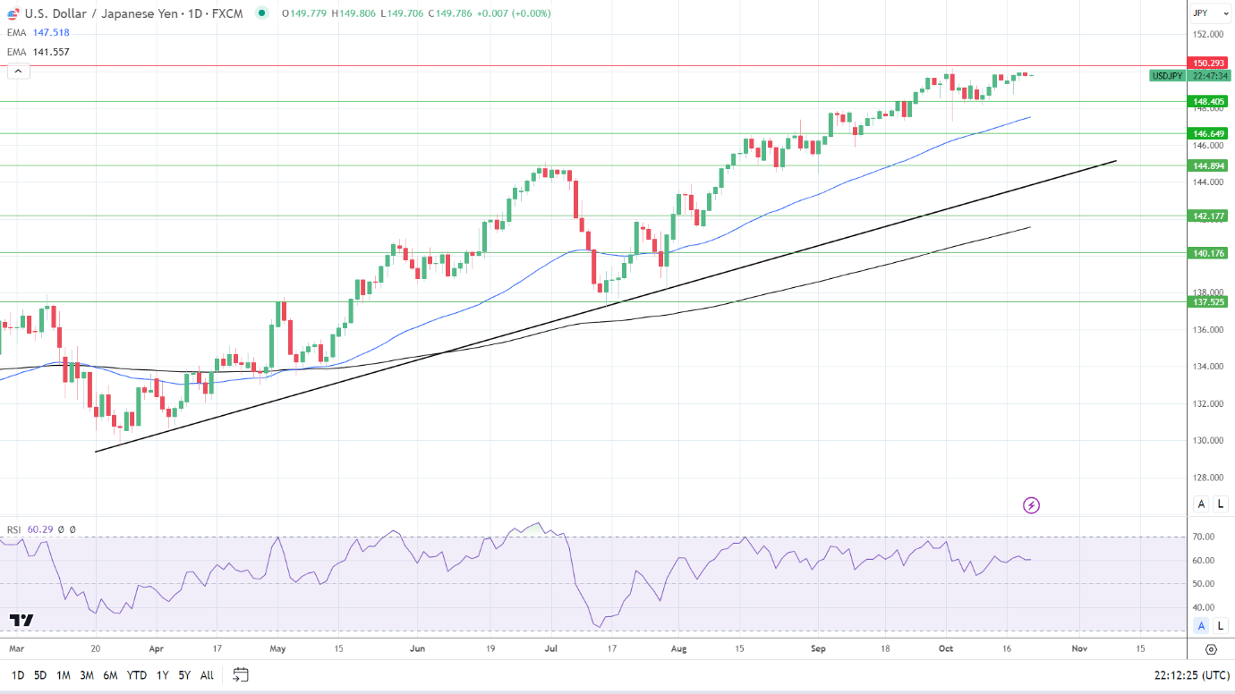 14天RSI为60.29,表明美元/日元在进入超买区域之前将突破150.293阻力位。