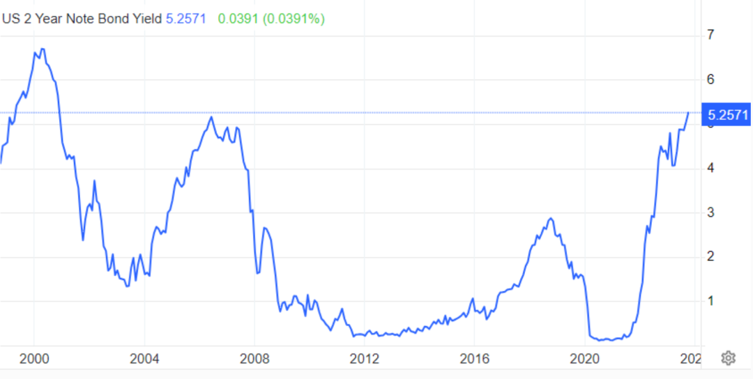 19日晚20时,美国两年期国债收益率创下17年新高至5.5292%,日内上涨3.90个基点,最新报5.257%。