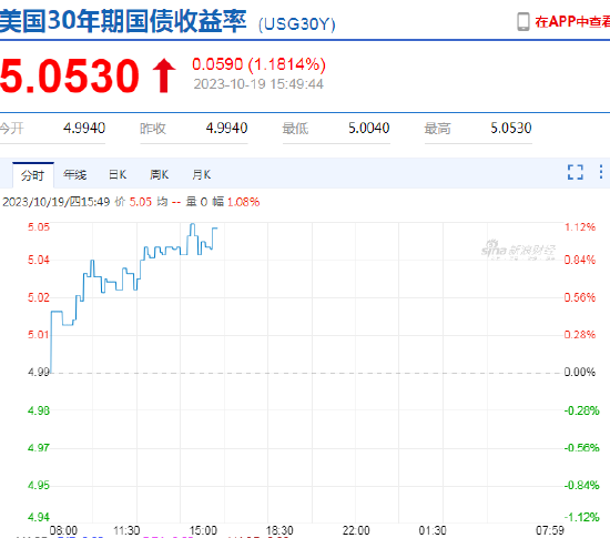 快讯:美国30年期国债收益率上升6个基点至5.05%,为2007年以来最高水平。