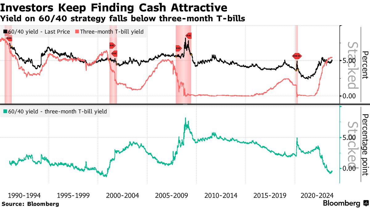 策略师们写道:“尽管高现金利率看起来很有吸引力,但投资者应该记住,持有国库券可能意味着今天以有限的风险收取5%的利息,但从长远来看,它会错过复利回报。”