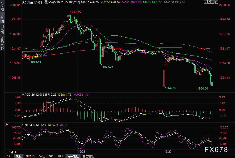 金价大幅跳空低开后反弹受阻,最低触及1964.23美元/盎司,目前交投于1965.89美元/盎司。