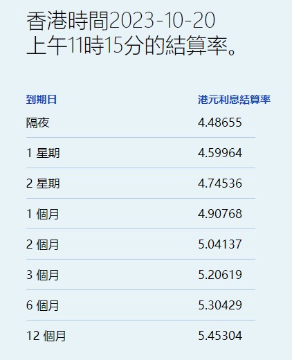 10月20日,港元拆息几乎全线反弹,仅六个月期续跌。其中,隔夜息升至4.48655%。与楼按相关的一个月拆息亦中止两连跌,由五周新低回升至4.90768%。