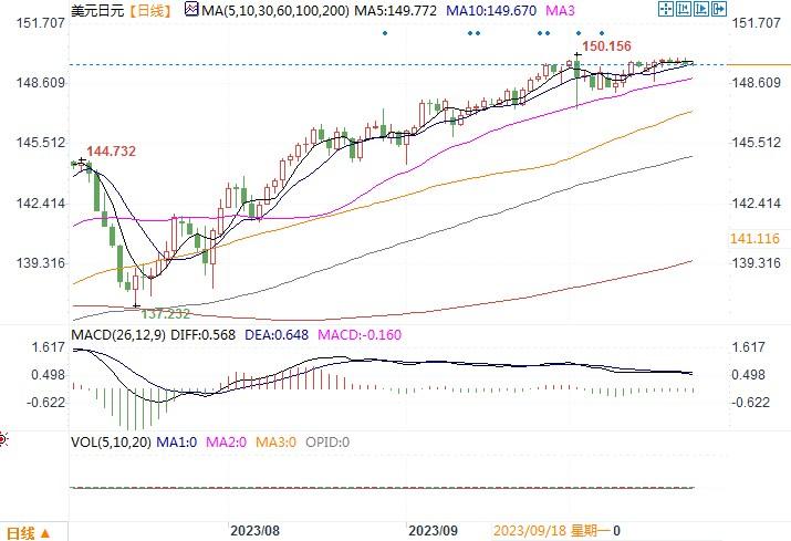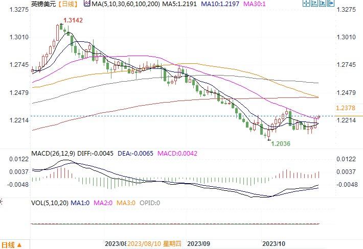周一(10月23日),受益于美元的回落,英镑/美元升0.7%,收盘于1.2248。美国公债市场仍然是投资者关注的焦点,周一美国指标性的10年期公债收益率自5%之上回落至4.8375%。美债长端收益率回落带动美元回落,英镑也是借机反弹回升。英国方面稍后将公布就业和采购经理人指数数据。若数据提气显示增长情况良好,或能继续给到英镑助力,刺激英镑进一步反弹上升。日线图上,英镑/美元在隔夜市场上已穿越过布林带通道中轨线且保持在中轨线远上方,技术指标MACD、RSI开始有上扬迹象,显示经过两周多的探低整理之后,镑美似乎产生反弹的欲望。上方还是要留意前期的强阻力水平1.2337,若能突破,反弹势能将会得到进一步增强。目前下方1.2130附近构成较强的支撑。