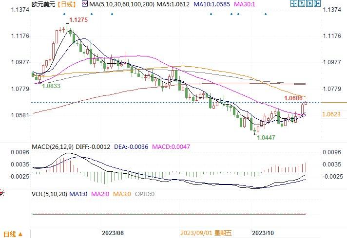 周一(10月23日),美元兑一篮子货币周一下跌,欧元/美元当天上涨了0.73%,高收盘在1.0668。周一美国指标10年期债券收益率在短暂升穿5.0%后回落。自7月中以来,美国公债收益率飙升,提升了美元相对于其他货币的吸引力,并帮助美元指数上涨超过6%,但该指数自10月初以来几乎没有取得进展。这不得不引起投资者深思,考虑美国长端债收益率的驻足不前,是否意味着本轮加息周期进入尾声。本周有大量数据公布,周四将公布美国GDP数据,此外还有加拿大央行(BOC)和欧洲央行(ECB)的会议。交易员都在密切关注上述的重要数据和事件。路透调查显示,虽然欧洲央行已经完成了加息,但至少要到2024年7月才有可能开始放宽政策。因此欧美央行都可能按兵不动的情势下,美元的多头仓位或许会遭到一定程度的出清。目前日线图上,欧元/美元隔夜市场上冲破了前期重阻力水平1.0650后挺进至布林带通道上轨方,技术指标配合性的上扬,显示欧元在抄底盘的推动之下上冲动能有所增强。上方进一步攻击目标有望瞄向1.08附近。而下方1.05-1.0530区域成为了较强的支撑所在。