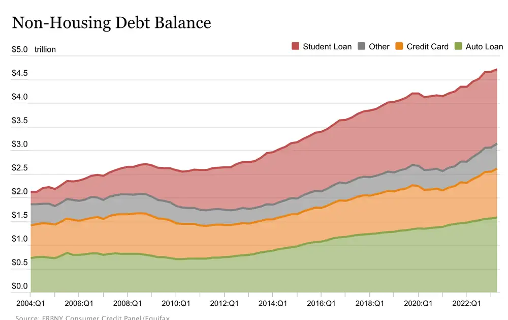 根据纽约联邦储备银行的数据,第二季非抵押贷款债务升至4.71万亿美元。创纪录的1.03万亿美元由信用卡债务组成,而1.58万亿美元由汽车贷款组成。