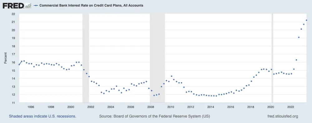 美联储数据显示,今年8月,商业银行信用卡利率飙升至21.19%。消费金融服务公司Bankrate的另一项分析显示,零售卡的平均利率约为28.93%,创历史新高。
