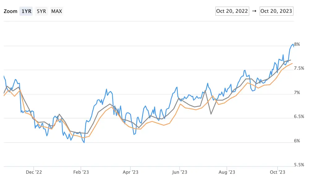 据估计,30年期固定抵押贷款利率刚刚攀升至8%以上。这反映了23年来美国最受欢迎的抵押贷款之一的最高借贷成本。