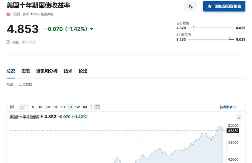 当地时间23日盘前,有着“全球资产定价之锚”称号的美国10年期国债收益率触及5%重要关口,创下2007年以来最高水平。开盘后,该期限国债收益率震荡走低,最终收于4.853%。