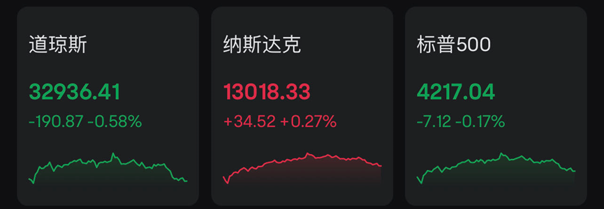 在10年期美债飙升刺激下,美股市场承压,隔夜三大指数低开。随着该期限美债收益率小幅回落,美股三大指数震荡调整。截至收盘,道指跌190.87点,跌幅为0.58%,报32936.41点;标普500指数跌7.12点,跌幅为0.17%,报4217.04点;纳指涨34.52点,涨幅为0.27%,报13018.33点。