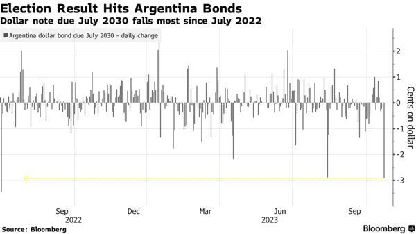上周末投票前,一些分析师预计,如果米莱获胜,债券价格可能飙涨,米莱主要提出放弃阿根廷比索、改用美元,很多经济学家认为此举将进一步加剧阿根廷的短期通胀。但如果没能得到多数投票支持,米莱的美元化计划前景仍未可知。