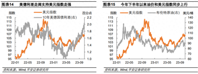 二是,美元指数或保持相对强势。首先,近期美债利率上行较快,令美德利差走阔,支持美元兑欧元汇率及美元指数上行。截至10月19日,10年美德国债利差扩大至2.04%,超过了2022年11月的高点(彼时美元指数升破110)。其次,美国经济仍呈较强韧性,而欧洲经济走弱信号更多、货币紧缩更缺空间,令美元更具备吸引力。最后,近期地缘风险上升、油价上行压力加大,削弱欧洲、日本等非美经济体增长前景,进一步加持美元指数。