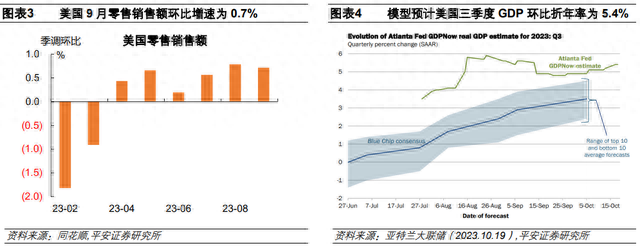 一是,美国经济数据继续好于预期,三季度GDP增长预期进一步上修。本周公布的经济数据显示,美国经济仍具韧性:一方面,9月零售数据意外强劲,零售销售额环比增速为0.7%,预期0.3%,前值由0.6上修至0.8%,反映美国消费者需求仍在稳健增长;另一方面,9月工业生产指数同样超预期上涨,环比增速为0.3%,预期0%,前值为0.4%,创2018年以来新高,工人罢工浪潮并未拖累制造业增长。零售和工业数据公布以后,亚特兰大联储GDPNow模型上修三季度GDP增长率预测,预计美国三季度GDP环比折年率为5.4%,不仅高于10月14日预测的5.1%,也是9月14日以来最高预测。