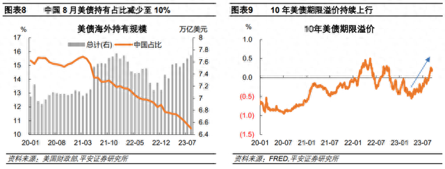 三是,关于美债供需的担忧持续,推升期限溢价。国债供给方面,自今年8月美国信用评级下调、美国财政部宣布增发,市场对于美债“超发”的担忧已成为美债利率上行的重要驱动(参考我们报告《美债利率为何再创新高?》)。10月以来,美国政府暂时避免关门,但围绕财政纪律的担忧仍在推升期限溢价。国债需求方面,10月18日,美国财政部数据显示,今年以来截至8月,两大海外美债持有者(日本、中国)大幅减持手中的美债,日中两国较2020-2022年平均减持超过3千亿美元的美债,其中,中国连续5个月减持,8月美债持有占比自15%以上减少至10%左右。总之,当前市场对于美债供需失衡的风险十分敏感,这也解释了10年期及以上美债利率较2年期更快攀升的现象。