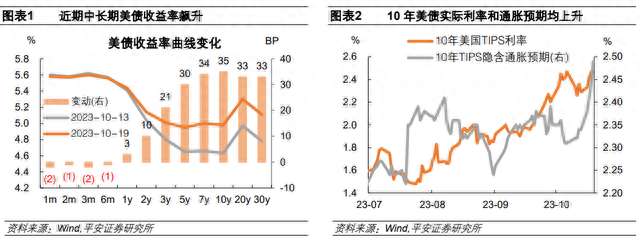 10年美债收益率本周大幅上升,盘中曾升破5%大关,继创2007年以来新高。2023年10月19日,10年美债收益率盘中升破5%,收于4.98%,近一周已累计上涨35BP。其中,10年TIPS利率(实际利率)累计上升20BP,至2.49%,隐含通胀预期上升15BP至,2.49%。近一周(截至10月19日),中长期美债收益率飙升,普遍刷新2007年以来新高。30年期美债收益率累计上涨33BP,至5.11%;2年期美债收益率累计上涨10BP,5.14%。