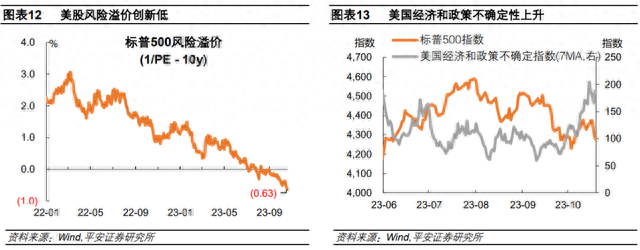 一是,美股波动与调整压力阶段上升。一方面,当前美股估值不低(今年以来标普500市盈率累计增长约16%),随着美债利率上升,股债性价比势必下降。截至10月19日,美股风险溢价指标(标普500市盈率倒数与10年美债利率之差)下降至-0.63%,继续创本轮新低。短期不排除部分股票资金流入债市,并制造股票市场波动的可能。另一方面,10年美债利率升破5%大关,暗示市场对于中长期美国经济、通胀和利率前景出现更大分歧,经济与政策不确定性上升,这也可能抑制股票市场风险偏好。