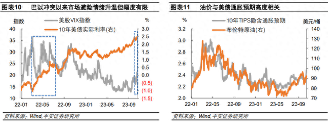 四是,地缘冲突并未显著驱动避险资金配置美债,反而抬升油价与通胀预期。自10月7日巴以冲突爆发以来,市场避险情绪虽有升温但幅度相对有限。近期美股VIX指数由17左右升破20,而2022年俄乌冲突时VIX曾升至30以上。巴以冲突爆发以来,美国多位官员到中东地区展开斡旋,暗示美国有意愿管控冲突、不希望战事扩大。10月18日拜登公开发言表示,美国支持以色列,但又提醒以方仍需遵守战争规则,给人道主义通道留下机会;他还提到,没有“明确证据”表明伊朗参与了近期的冲突。不过,与2022年类似,地缘冲突增加了全球原油等能源供给的不确定性,赋予油价上涨风险,继而令美债市场的通胀预期明显抬升。截至10月19日,布伦特原油回升至92.4美元/桶、创10月以来新高,而美债通胀预期与国际油价高度相关。