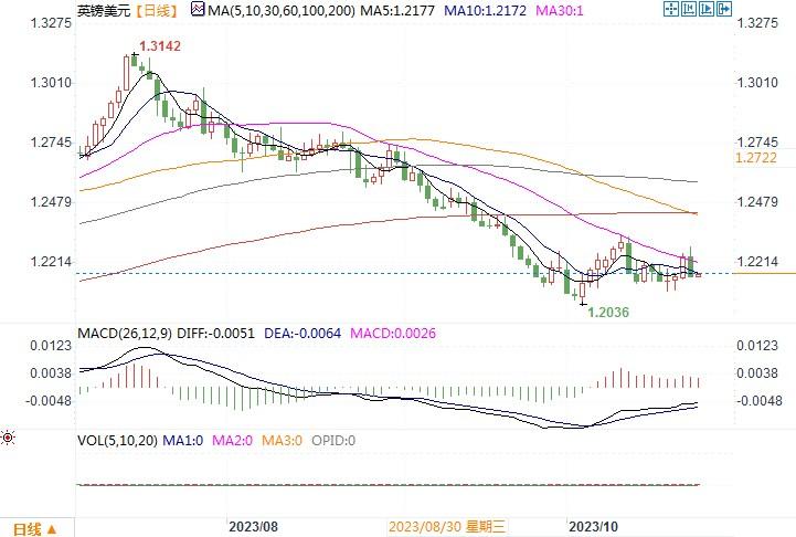 周二(10月24日),英镑/美元尾盘下跌0.72%,报1.2161美元。周二的一项调查显示,10月英国标普全球服务业采购经理人指数(PMI)初值从9月份的49.3降至49.2,为1月份以来的最低值,并连续第三个月低于50的荣枯分水岭。英国企业活动10月再次下滑,成本压力进一步降温,凸显了经济衰退风险。利率期货市场显示,交易员认为英国利率现已在5.25%触顶,有可能从6月左右开始下调。如果接下来,英国央行下周的利率会议将会引起投资者的重点关注。若有任何迹象显示英国央行从最早加息的央行变成最快进入降息的央行,那么英镑或会受到冲击出现下行的风险。日线图上,隔夜一根大阴柱,再度将英镑压制在布林带通道中轨线之下,显示英镑当前的表现还是颇为脆弱。下方1.2130附近的支撑较为关键,若失守,英镑恐会再度进入探低的轨道之中。