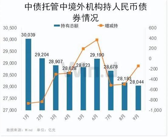 Wind数据显示,以最新中债托管数据来看,目前9月份境外机构持有中国债券2.8万亿元,环比小幅减持139.22亿元,减持规模在大幅减小。此前5月和6月份曾一度连续出现增持,可见尽管今年外资减持稍多于增持,但整体持有人民币债券规模仍较大。