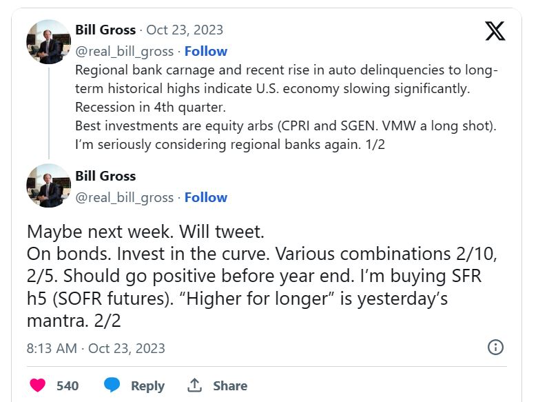 格罗斯透露他现在有不同看法 “地区银行的动荡和汽车贷款的最近上升,将导致利率长期保持历史高位,这表明美国经济显著放缓。”他补充说:“四季度出现经济衰退。”