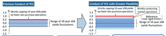 2016年,日本央行推出了YCC——通过无上限的购债,坚决压低日本10年期国债收益率。年内早些时候,该行将正负0.5个百分点的收益率区间上下限从“严格限制”改为“参考”,允许长期利率波动幅度一定程度上超过正负0.5%。