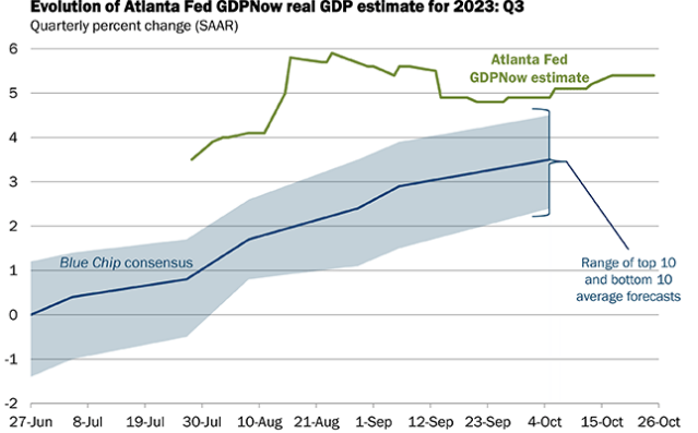 当地时间周四,美国商务部将公布三季度国内生产总值(GDP)初读数据。华尔街最新预测显示,上季度美国GDP增速将升至4%以上,创2021年四季度以来最快增速。不过随着美联储加息周期进入尾声,经济火热和通胀依然远离目标是否会让美联储进一步收紧政策,预期中的增长拐点以及是否会引发经济衰退等话题,正在引发广泛讨论。