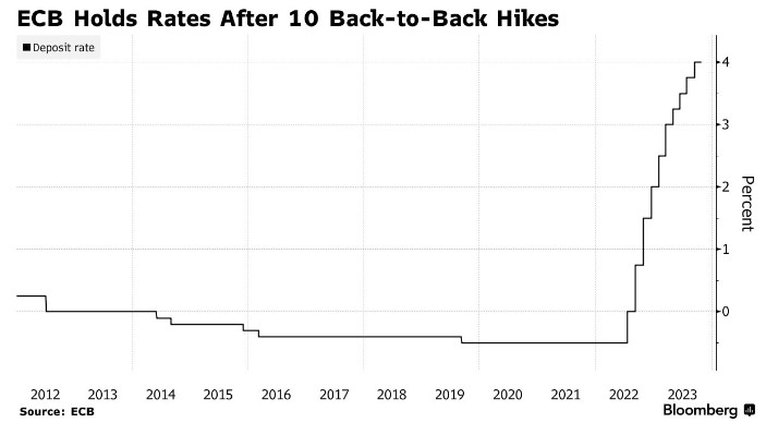 欧洲央行一年多来首次维持利率不变,以观察一系列前所未有的加息能否成功抑制通胀。继上个月将存款利率提高到创纪录的4%之后,欧洲央行周四按兵不动,符合市场预期。