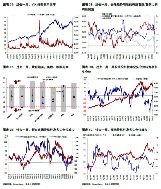 ►情绪仓位:黄金超买,欧美股市超卖。过去一周,超买超卖情绪上,黄金达到超买,欧洲股票接近超卖。投机性仓位方面,美股转为投机性净多头仓位,新兴市场投机净多头仓位减少,美元投机性净多头仓位增加,黄金投机性净多头仓位增加,10年美债净空头仓位减少,2年美债净空头仓位增加。