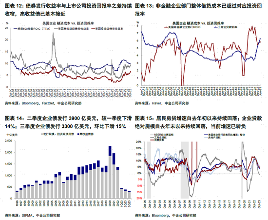 ►企业部门:高收益债利率已接近投资回报率,整体贷款成本则已超过;企业债发行连续2个季度萎缩、工商业贷款增速转负。当前美国投资级债券收益率升至6.5%,为2009年以来最高,与标普500 ROIC的10%还有约350bp,而9.3%的高收益级债券收益率为2016年以来新高,与10%的ROIC已缩窄至不到100bp。进一步对比企业部门整体的投资回报率和贷款利率,截至二季度末工商业贷款利率已升至6.3%,超过非金融企业部门5.8%的ROIC。