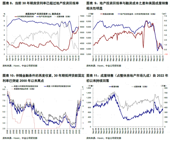 ►居民部门:房贷为主,房贷中固定利率贷款占比又超九成;当前有效利率与居民付息压力都偏低。居民部门信贷主要为房贷(截至2022年末,美国居民房贷占72%、消费贷占28%),虽然30年期房贷利率10月下旬已突破8%,为2000年以来最高,但由于固定利率贷款占绝对主导,截至二季度末占比达94%,因此实际付息成本基本不受利率走高影响。截至9月末,美国房贷有效利率仅3.7%,对比疫情前的3.9%和金融危机前的5.5%则依然偏低。对比收入,三季度末居民利息支出占收入仅小幅升至5.3%,仍在历史低位,明显低于2008年金融前的8.4%。