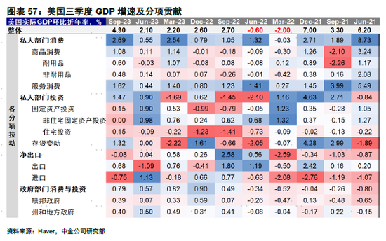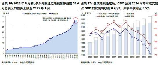 ►政府部门:政策决策更重要;除非再度出现意外事件,否则也难以大幅扩张。原因有二:1)债务上限问题解决后对明年财政支出形成约束。今年6月初债务上限问题解决的条件是对2024和2025财年可选支出(discretionary spending)上限的限制。该法案通过后,CBO预测2024财年赤字率由5月基准假设的5.8%收缩至5.5%。2)大选年,尤其是总统和掌握财税更主要权限的众议院分属不同党派时,财政扩张的可能性较小。