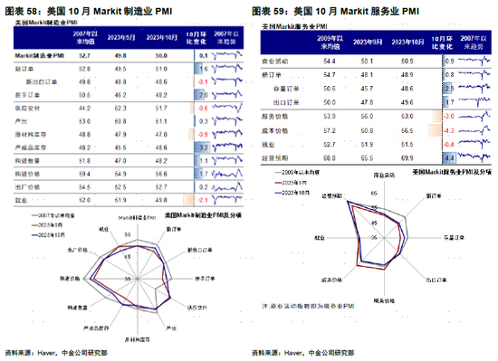 ►基本面与政策:美国GDP超预期上升,制造业及服务业PMI均抬升。美国三季度GDP超预期抬升。美国三季度GDP环比折年率4.9%,前值2.1%,高于一致预期4.5%,但大幅低于GDPNow模型5.4%。分项来看,消费是主要贡献(贡献2.7ppt),库存转为贡献(1.3ppt),但是备受关注的前两个季度在加速的私人投资明显降温(0ppt),房地产虽有修复但不算强(0.15ppt),说明高利率和信用周期的“地心引力”在发挥作用。往前看,财政和私人信用都难以再大幅扩张,发债规模大概率降低,经济大方向是逐渐放缓,除非再出现类似银行业危机等意外风险事件。美国10月Markit制造业PMI重回扩张区间,服务业PMI小幅抬升。美国10月Markit制造业PMI 录得50.0(vs. 预期49.5,9月49.8);服务业PMI 录得50.9(vs. 预期49.9,前值50.1);制造业PMI时隔5个月重回扩张区间,其中新订单、产出、产成品库存及价格分项抬升,原材料库存、就业回落;服务业PMI(即商业活动分项)经历了此前连续4个月的回落后再度小幅抬升,新订单抬升,但价格及就业分项回落。