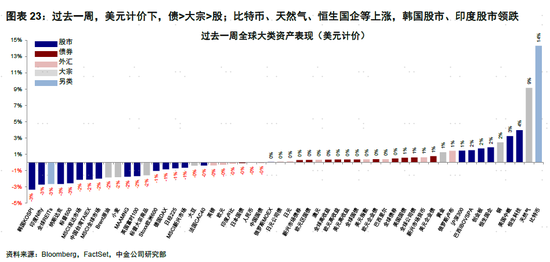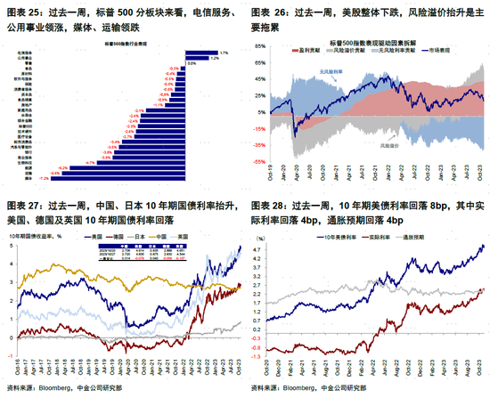 ►资产表现:债>大宗>股;美股下跌,美债利率回落。本周公布的三季度GDP超预期抬升,消费韧性但投资和地产并未大幅抬升,一定程度或仍受到高利率环境的制约。这一数据相较于此前市场关注度较高的GDPNow预测存在较大差异,提前博弈的部分资金或在数据公布后被迫回补仓位,导致市场呈现增长数据强、但美债利率回落的情形。美股方面,本周Meta、谷歌、微软等科技龙头公布三季度财报,但并未有效提振市场情绪,成长风格落后。