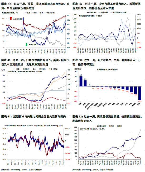 ►资金流向:货基转为流入,股基流出放缓,债基流入加速。过去一周,货币市场基金转为流入,股票型基金流出放缓,债券型基金流入加速。分市场看,各主要市场股市中,日本及中国转为流入,美国、新兴市场及中国流出放缓,发达欧洲流出加速。