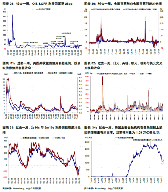 ►流动性:离岸美元流动性转松,逆回购使用量维持低位。过去一周,OIS-SOFR利差回落至28bp,美国高收益债信用利差走阔,投资级债券信用利差收窄;衡量离岸美元流动性的指标上,日元、英镑、欧元、瑞郎与美元交叉互换均收窄。美国主要金融机构在美联储账上逆回购使用量有所回落,当前使用量为1.09万亿美元/天。