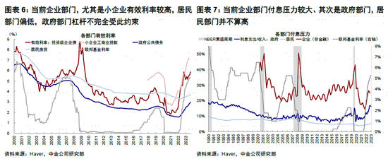 ►政府部门:存量美债中长期为主,有效利率低,付息压力较高;但杠杆不完全受此约束。存量国债主要为中长期(占比70%),但利率抬升影响主要体现在短期国债、浮动利率国债以及部分到期的中长期国债,这就使得政府部门债务有效利率的抬升比美联储加息更滞后,当前有效利率从2022年2月的1.57%升至2.91%。对比收入,政府付息压力升至三季度末的16.3%,为1996年以来最高。不过,政府杠杆并不完全受此约束。