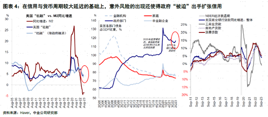 从这个意义上,本轮美国经济周期从“软着陆”到“再加速”的“横跳”,核心问题也在于此。本轮货币紧缩向信用紧缩传导不畅,主要有三点原因:1)广义投资回报率高于融资成本,使得增量需求回落缓慢;2)高利率对已锁定的存量付息压力传导有限,没有大幅侵蚀消费和支出;3)政府部门信用不完全受上述经济和成本因素主导,如今年二季度因债务上限解决和银行风险暴露“被迫”扩张,还抵消了私人部门的收缩,成为了三季度经济再加速的“源头”。所以,回答紧缩的够还是不够,要从存量和增量并结合各部门情况逐一分析。