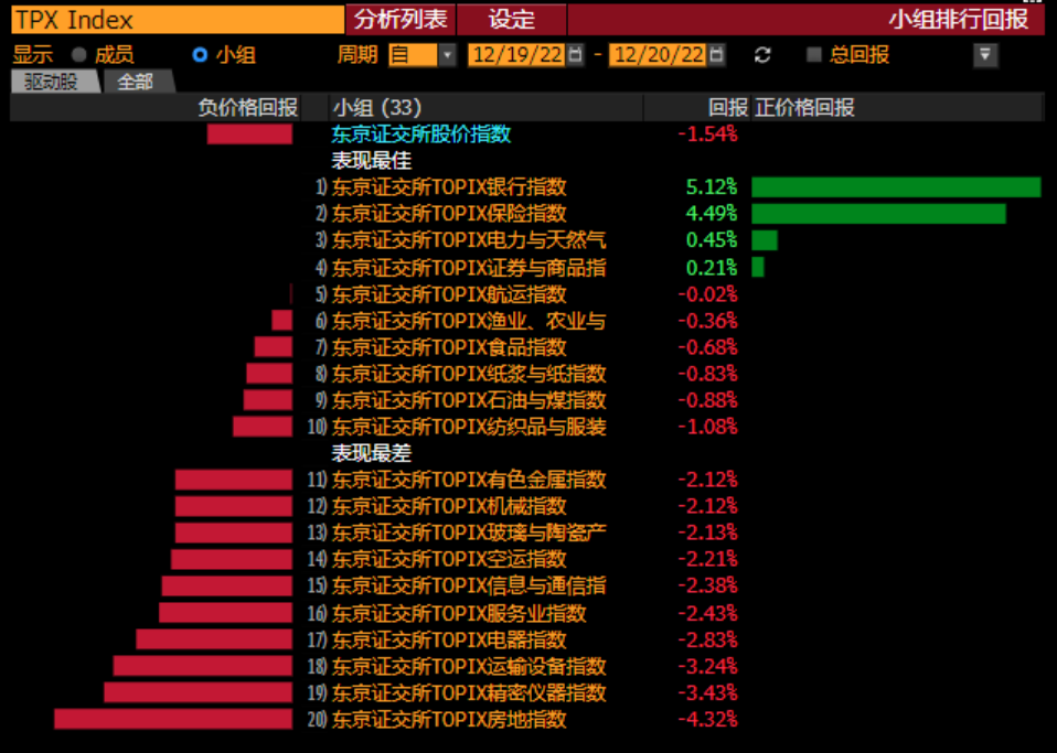 图表13:2022年12月日本央行调整当天的日本股市各行业的表现排名