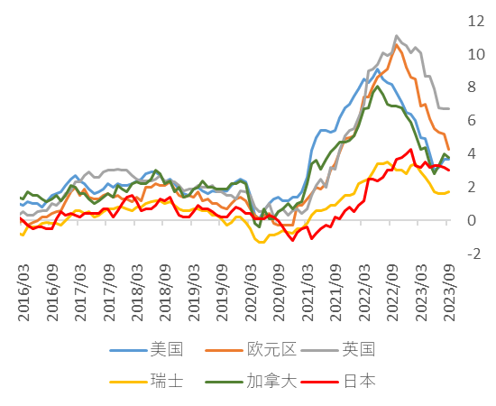 图表6:主要发达国家的综合CPI同比走势 (%)