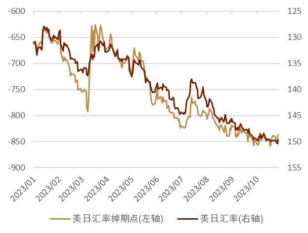 最近2年,美日汇率的掉期点(美日短端息差决定)对美日汇率或起到重要的锚定作用(图表12)。而美日短端息差当中,美国的短端利率起到了决定性作用。我们认为在1-3个月左右的维度内,美国利率或依旧维持在高位,美日汇率或仍旧高位停留。但往2024年下半年走,我们认为市场或对美联储产生降息预期,届时日元或能由弱转强。